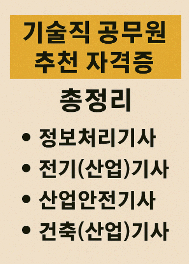 기술직 공무원 시험은 다양한 직렬로 나뉘며, 각 직렬마다 추천되는 자격증이 상이합니다. 여기서는 대표적인 직렬들을 기준으로 어떤 자격증을 준비하면 유리한지 자세히 살펴보겠습니다. 토목직 공무원 추천 자격증: 토목기사, 토목산업기사, 측량기능사 토목직은 도로, 교량, 하천, 상하수도 등 각종 인프라를 설계·감독·유지하는 업무를 담당합니다. 토목기사나 산업기사 자격증은 시험 가산점뿐 아니라, 근무지 배치 시 실무 이해도 측면에서도 긍정적인 평가를 받습니다. 건축직 공무원 추천 자격증: 건축기사, 건축산업기사, 실내건축기능사 건축직은 공공건축물의 설계 및 시공 감독, 건축 행정 등을 담당합니다. 건축기사 자격증은 5% 가산점을 받을 수 있으며, 실제 공사 설계 및 검토 업무 수행 시 매우 유용하게 작용합니다. 실내건축 관련 자격증도 일부 지자체에서는 참고자료로 활용됩니다. 전기직 공무원 추천 자격증: 전기기사, 전기산업기사, 전기기능사 전기직은 공공시설물의 전기설비 점검, 유지보수, 에너지 효율 관리 등의 업무를 맡습니다. 전기기사 자격증은 시험 가산점은 물론, 실무 투입 시 기초 자료 해석과 설계 이해력에서 큰 차이를 만들어 냅니다. 기계직 공무원 추천 자격증: 기계설계기사, 기계정비산업기사, 설비보전기능사 기계직은 기계장비 관리, 공공설비 유지보수, 기계도면 검토 등의 업무를 수행합니다. 특히 설계 능력이나 정비 경험을 요구하는 부서에서는 관련 자격증 소지 여부가 실무 투입 속도에 큰 영향을 미칩니다. 통신·정보직 공무원 추천 자격증: 정보처리기사, 네트워크관리사, 정보보안기사 ICT 기반 공공시스템 구축, 네트워크 보안 관리, 전산 인프라 운영 등을 담당합니다. 정보처리기사는 필수 자격으로 여겨지며, 정보보안기사는 보안 관련 부서 근무 시 매우 우대됩니다. 디지털 전환이 가속화되면서 통신직 수요는 더욱 증가하고 있습니다. 환경직 공무원 추천 자격증: 대기환경기사, 수질환경기사, 폐기물처리기사 환경직은 환경오염 모니터링, 환경정책 집행, 하천·대기 관리 등의 업무를 수행합니다. 관련 기사 자격증은 가산점뿐 아니라, 측정장비 운용, 환경보고서 작성 등 실무에서도 필수적인 역량으로 작용합니다. 각 직렬마다 자격증은 채용 기준뿐만 아니라, 직무 수행 시 전문성과 신뢰도를 높이는 중요한 기준이 됩니다. 특히 기사급 자격증은 공무원 외에도 공기업이나 준정부기관 기술직 지원 시에도 활용도가 높아, 범용성이 뛰어난 자산이 됩니다.